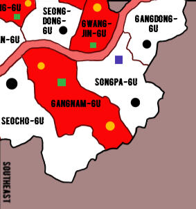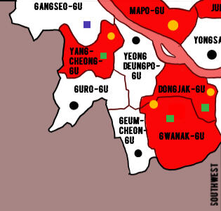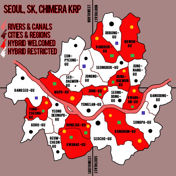 AMONG THE MAP WE HAVE FOUR REGIONS EMCOMPASSING THE ENTIRE CITY OF SEOUL, NORTHWEST, NORTH EAST, SOUTHWEST AND SOUTHEAST.red sections mean that hybrid sanctions are followed and regulated to the utmost limit, hybrid kind is accepted in these places, and is the safest place for them -- while there are still some who oppose hybrids, humans in these sections have best learned how to live alongside them and accept them.the white sections mean that the hybrid sanctions are typically only followed and regulated against hybrids. the law only works in favor for the humans, as crooked law enforcement ravages these parts and want nothing to do with accepting hybrid kind. they will do anything and everything, no matter the law, to twist and see that they rid their jurisdictions of hybrids. these are unsafe, and treacherous areas and must proceed wtih caution.